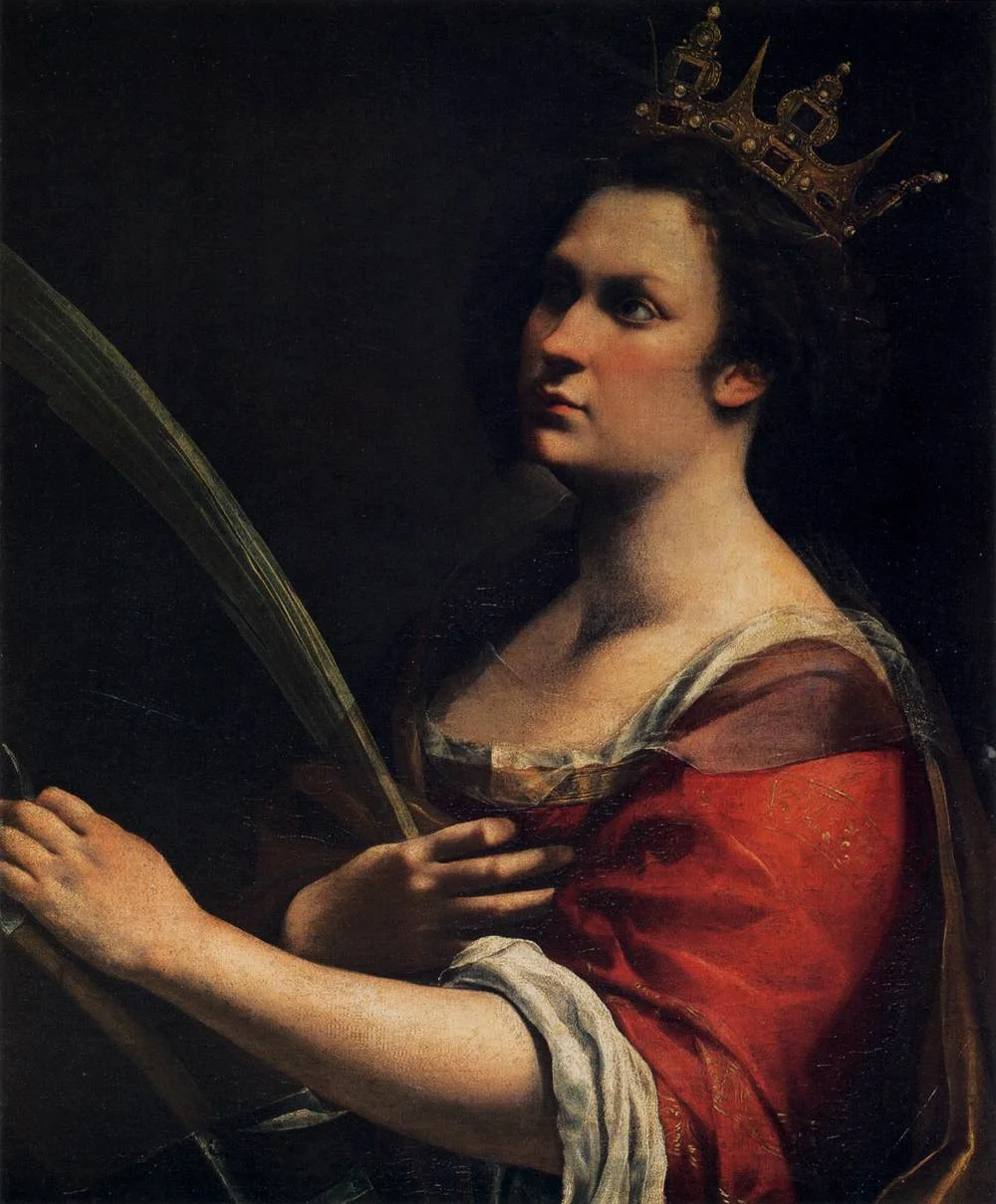 The shadows in this image are harder as well, and the color palette is more similar to a Caravaggio painting, with an abundance of red and warm hues and a total absence of blue. The saint is pictured with her attribute, the wheel, extending off the canvas. This is also reminiscent of a Caravaggisti style, recalling Caravaggio's "Conversion of St. Paul." Finally, the hand position is similar to Artemisia's "Self-Portrait as a Female Martyr," but the anatomy and shadows are more naturalistic and less stylized. Nearly all of the ingredients of Artemisia's best paintings are found here.